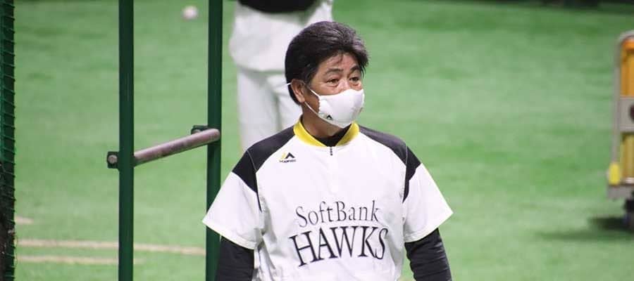 マスク姿で練習を見守るソフトバンク・工藤公康監督【写真:福谷佑介】