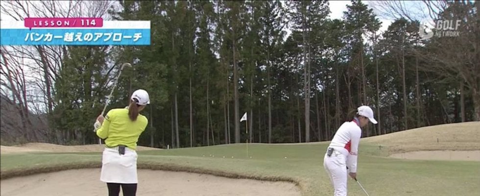 バンカー越えで、ピンまでの距離が約20ヤードのアプローチ。このようなケースでは、いつものボール真ん中で、ハンドファーストで打つ」方法よりも、ボールを少し左足寄りに置き、フェースを開いてハンドレイトでとらえると、簡単に球が上がるしミスショットにもなりにくくなります。