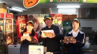 レクザムボールパーク丸亀内売店で販売されている丸亀名物骨付鳥の肉が乗った「とっと焼うどん」-Ballpark…