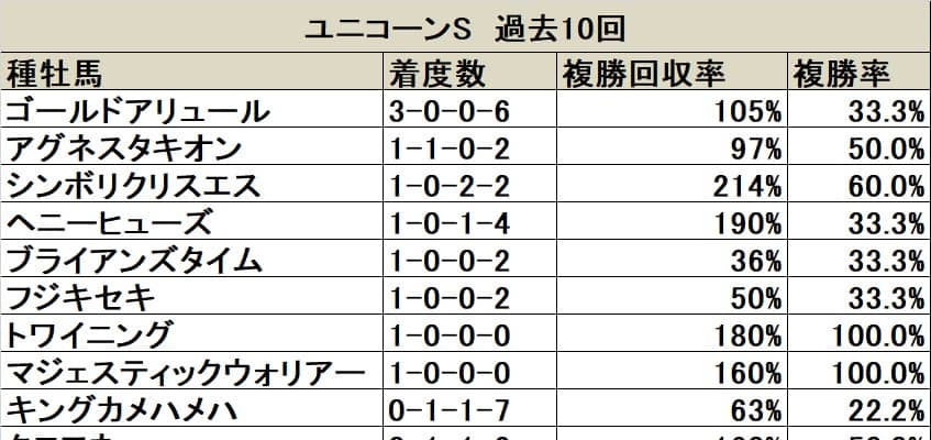 過去10年で最多となる3回の馬券絡みがゴールドアリュールとシンボリクリスエス。2回でアグネスタキオン、ヘニーヒューズ、キングカメハメハ、クロフネが続いている。