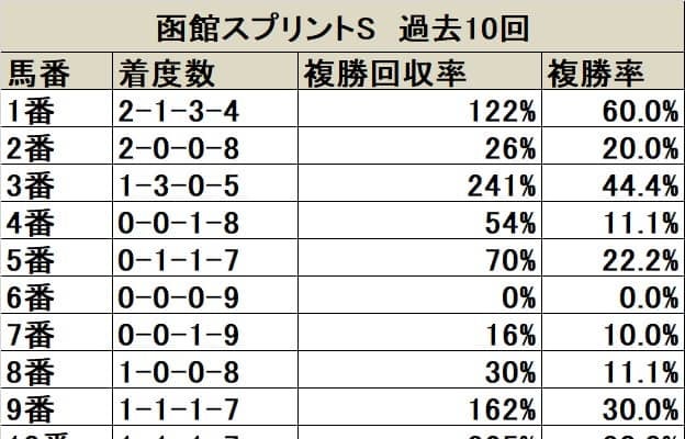 21日に函館競馬場で行われる函館スプリントS(3歳上・GIII・芝1200m)について枠順・馬番別に検証していく。な…