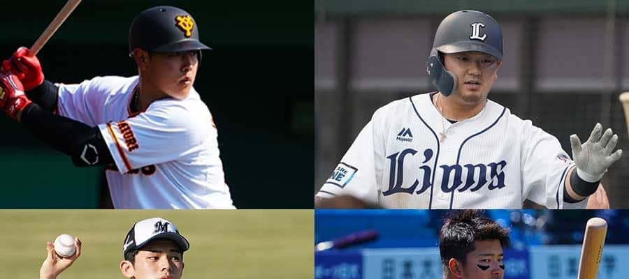 巨人・岡本和真、西武・森友哉、ヤクルト・村上宗隆、ロッテ・佐々木朗希(左上から時計回り)【写真:荒川祐史】