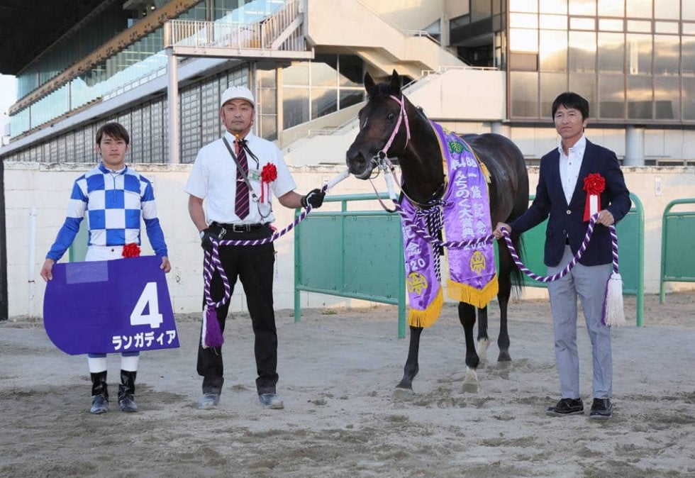 21日、水沢競馬場で行われた11R・みちのく大賞典(M1・3歳上オープン・ダ2000m)で1番人気、鈴木祐騎乗、ランガディア(牡6・岩手・板垣吉則)が快勝した。2.1/2馬身差の2着にセンティグレード(牡9・岩手・千葉幸喜)、3着に2番人気のエンパイアペガサス(牡7・岩手・佐藤祐司)が入った。勝ちタイムは2:13.0(良)。