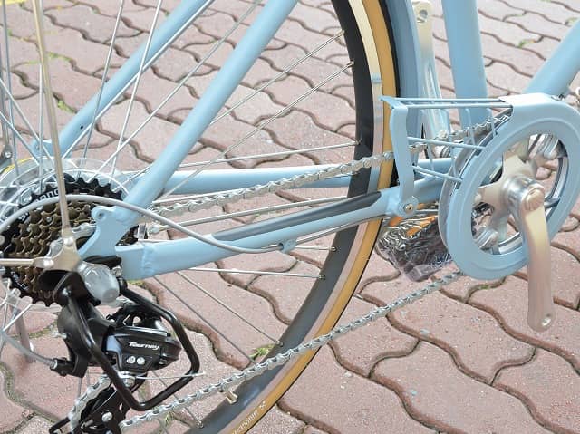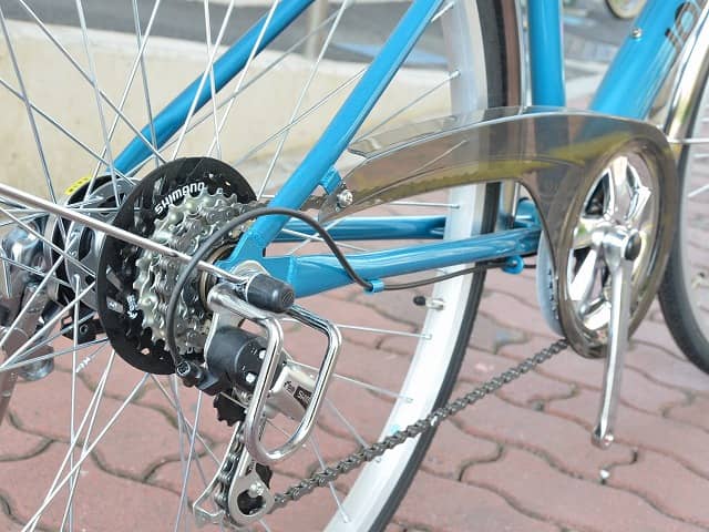 チェーンガードのデザインもオシャレ。後ろのみにギアが付いた外装7段変速
