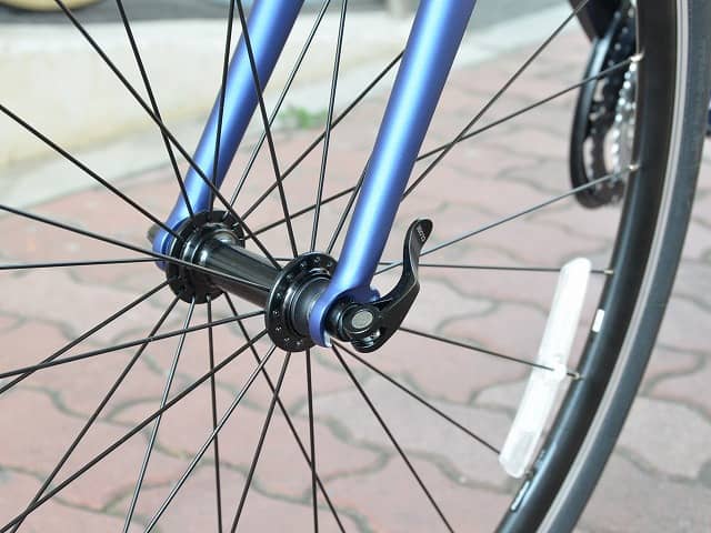 車輪のシャフト(軸)はクイックレリースで止められ、前後輪は簡単に脱着できる(以上2枚は後述のクロスバイクRAIL700のもの)