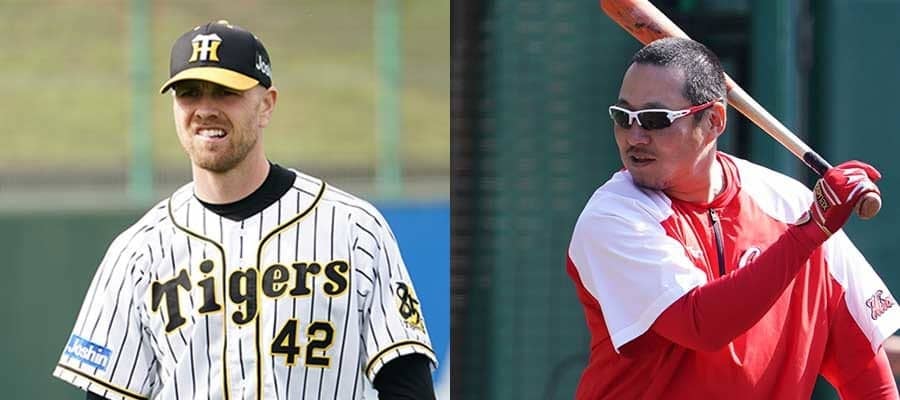 阪神のジョン・エドワーズ(左)と広島・松山竜平【写真:荒川祐史】
