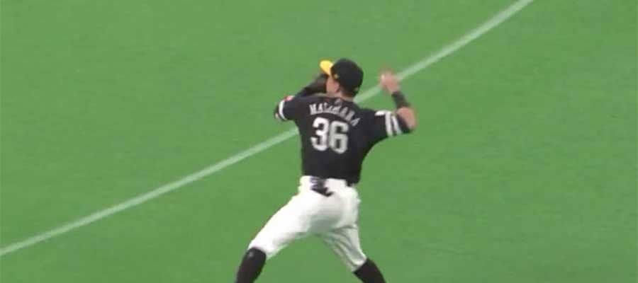 そのまま驚くべき速さでボールを握り変えると、流れのままにジャンピングスロー。体はセンター方向に流れていたものの、強引に送球を送ると、見事なストライク送球。ヘッドスライディングで頭から突っ込んだ大田を間一髪でアウトにした。