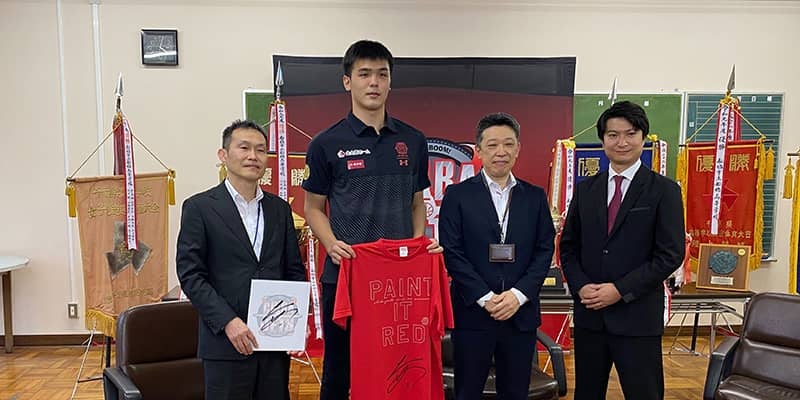 千葉ジェッツと特別指定選手(プロ契約)として契約した赤穂雷太が、7月7日、母校の千葉県船橋市立船橋高校を表敬訪問。市立船橋高の都丸輝信校長に千葉への契約報告のあいさつを行い、その後、千葉の田村征也社長とメディア対応を行った。