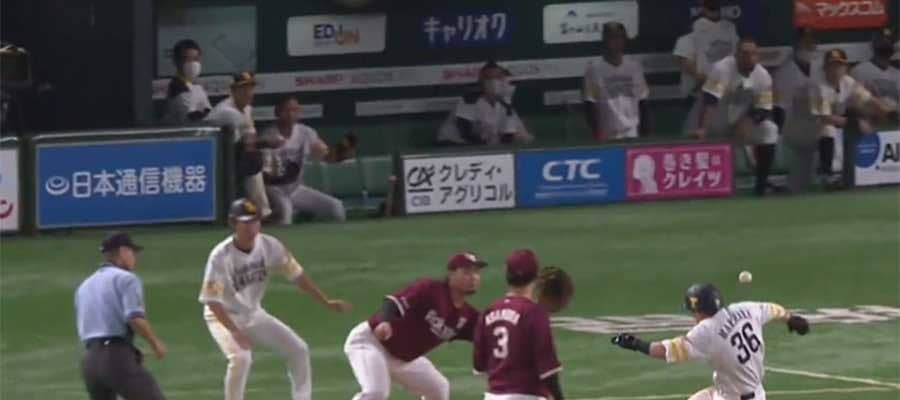 珍事は8回無死一塁のソフトバンクの攻撃中に起きた。バントの構えを見せた打者・三森は酒居の内角低めカーブにバットを引いたが、その投球を捕手・太田がキャッチできず。三森は二塁方向を指差した。一塁走者・牧原は果敢に二塁へスタートを切ったものの、太田の素早い処理で一、二塁間の挟殺プレーに。ここで太田の送球を受けた遊撃・茂木の一塁送球が牧原のヘルメットをかすり、一塁ベースコーチの本多コーチの頭部付近にも直撃してしまった。