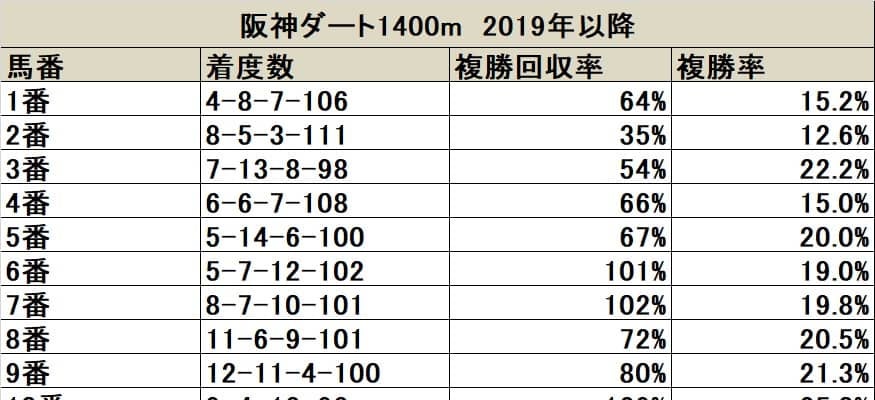 12日に阪神競馬場で行われるプロキオンS(3歳上・GIII・ダート1400m)について枠順・馬番別に検証していく。なお、今年は開催日割の変更に伴い阪神ダート1400mにて施行されるため、2007〜2010年のプロキオンSおよび2019年以降の当該コース成績をデータの集計対象とした。