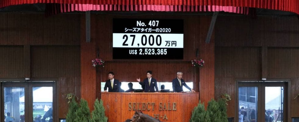 14日、北海道苫小牧にあるノーザンホースパークで、日本最大のサラブレッド市場「セレクトセール2020」2日目が開催。当歳馬セールにて上場番号407番・のシーズアタイガーの2020(牡)が2億7000万円で落札された。