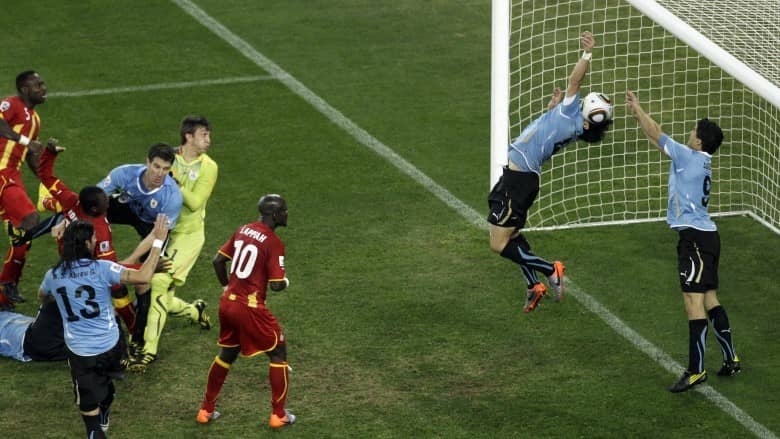 今回挙げた試合のうち、僕が実況しているのはこの試合だけです。1-1でゲームが進行し、延長後半ほぼラストプレーという状況の121分、ガーナのシュートをルイス・スアレスが自陣ゴール前で手を使って弾き出しました。名波浩さんと一緒に現地で実況していましたが、「何が起こったんだ」と事態がつかめず、絶句した記憶があります。