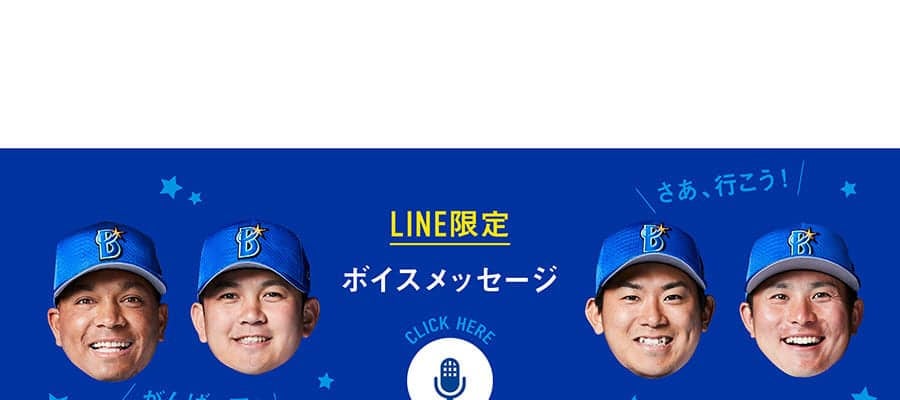 球団公式LINEアカウントでは、友だち登録済みのユーザーへ定期的に情報発信されるほか、試合情報やグッズ・ファンクラブページがすぐに確認できるメニューを掲載している。今回はLINE限定企画として「LINE限定ボイスメッセージ」がスタート。トーク画面上に特設メニューが設置されており、メニューをタップするだけで選手によるボイスメッセージが登場する。
