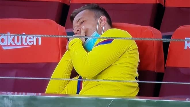 ラ・リーガ第37節のFCバルセロナ対オサスナの試合(1-2)で、テレビカメラにあくびをしながらくつろぐアルトゥールの姿が捉えられた。