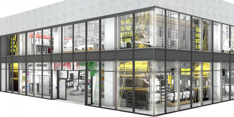 再開発された宮下公園に新たにオープンする同店舗では「東京」を店舗全体で表現。店作り、品揃えの双方で街をテーマに取り組んでいくのは、2019年秋にロンドンにオープンした店舗に続き、2店舗目となる。また、店作りもサステナブルであることを意識し、1階のサステナビリティエリアでは、什器・装飾ともにリサイクルポリエステルやファブリックを出来る限り使用している。