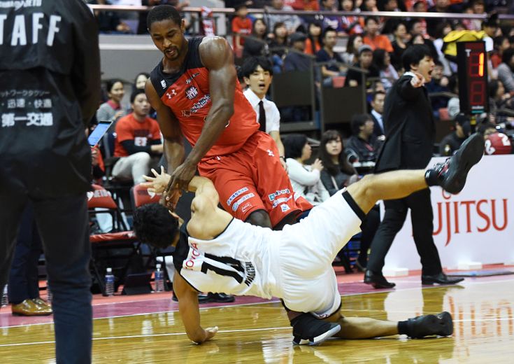 この残念な一大事件は、第1クォーター残り約3分半に起こる。千葉のヒルトン・アームストロング、A東京の菊地祥平が衝突してもつれた後、冷静さを失ったアームストロングが菊地をフロアに投げ倒してしまったのだ。