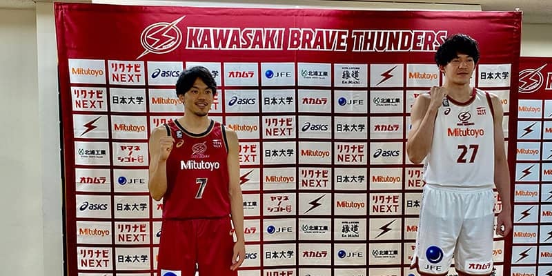 新たなデザインのユニフォームに袖を通して登場した篠山竜青と熊谷尚也。篠山は「久しぶりにユニフォームを着ました。先日佐藤HCが『Bリーグ、日本だけでなく、アジア、世界で戦えるクラブにしたい』と話をしていましたが、川崎から世界に発信しているミツトヨさんと一緒に戦えることにわくわくしています」と共闘を誓った。