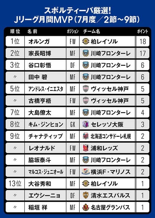 そして決まった7月度のMVPは、柏レイソルのオルンガ。Jリーグが選定した7月度のMVP家長昭博(川崎フロンターレ)をぎりぎり1ポイント上回った。