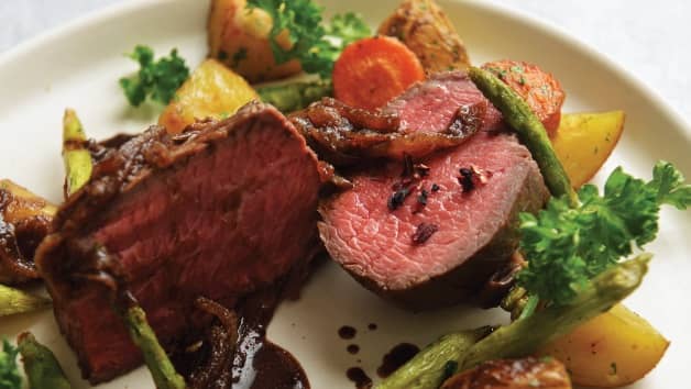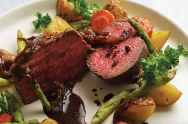 アンガス牛のロースト じゃが芋とアスパラのグランメール風 オニオンバルサミコソース