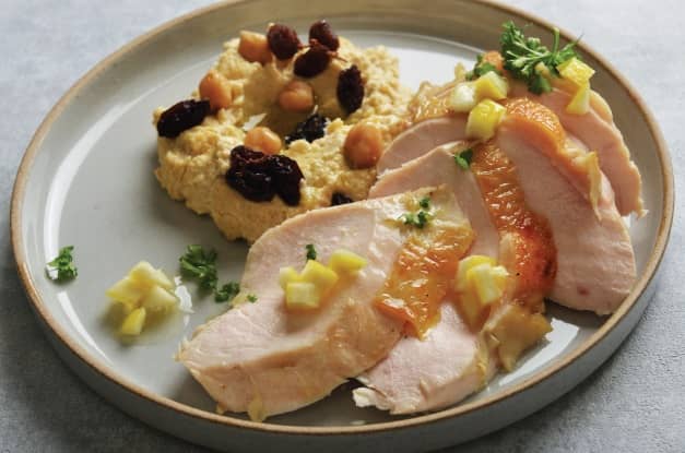 大山鶏胸肉のロースト、干し葡萄入りのフムス、塩レモンのコンディマン