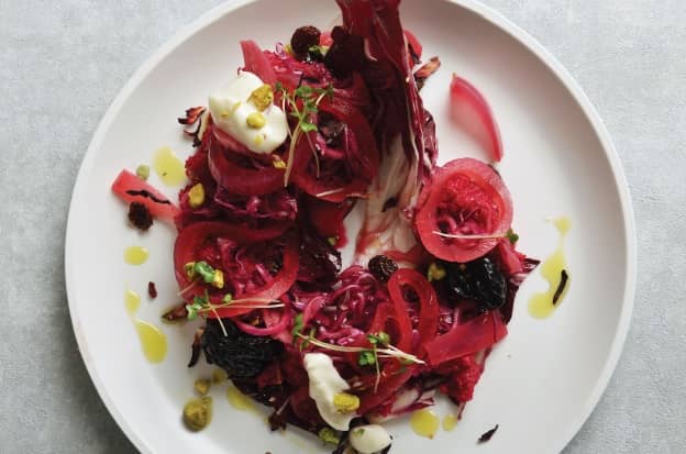 アーリーレッドと紫キャベツのアグロドルチェ,ビーツとミントのペースト, クリームチーズとドライフルーツ、ピスタチオ