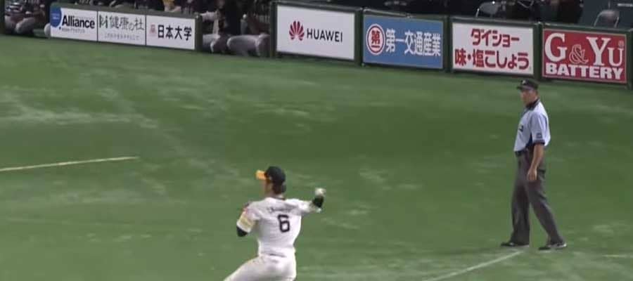 三遊間最深部の難しいバウントを逆シングルで好捕すると、そのまま振り向きざまに一塁へノーバウント送球を披露。伏見が懸命に一塁を駆け抜けセーフとなったが捕球から送球までの華麗な動きに球場は拍手が巻き起こった。