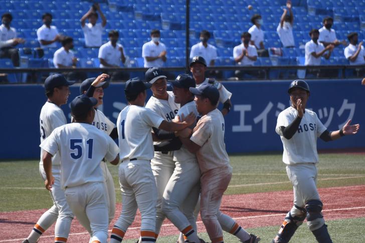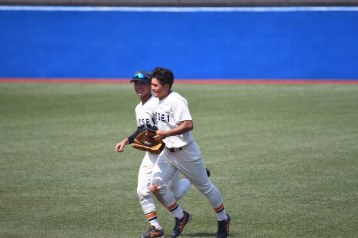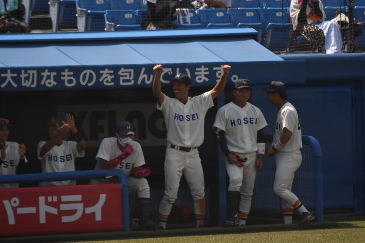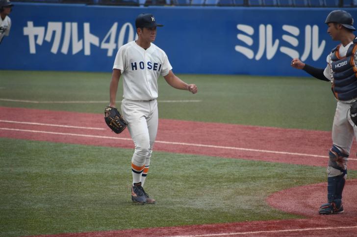 その後は5回から9回まで水澤天(営4)、鈴木昭汰(キャ4)、高田孝一(法4)、落合竜杜(法4)の細かな継投で相手を無失点に抑える。一方で法大打線も入江相手に3回の得点以降、何度も得点機を作るも決定打に欠け、9回7安打1失点10三振と抑えられ、1対1の同点で今季2度目のタイブレークに突入する。
