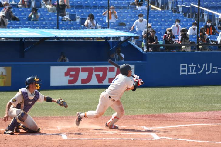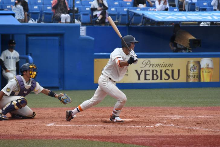 11回は両チーム無得点に終わり、迎えた12回表、先頭の大柿が犠打を決め、勝ち越しの機会を作ると、ここでリーグ戦初打席となる海﨑雄太(文2)に打席が回る。フルカウントからの6球目、打ち上がった打球が前進守備の内野と外野の間に落ちる中前適時打となり、この試合3度目となる勝ち越しに成功する。
