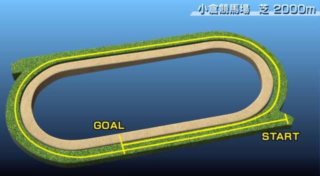 小倉芝2000mは4コーナー脇のポケットからのスタート。初角となる1コーナーまでの距離は470mほどと長く、前半のペースは速くなりやすい。直線の後半から上り、2コーナー過ぎで最頂部を迎える。そこからは下りが続き、残り400m地点からは平坦。