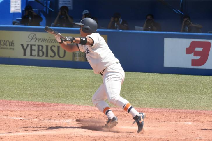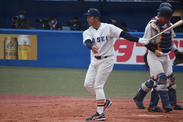 続く2番・永廣知紀(営4)と4番・村田雄大(人4)が安打で出塁し、迎えるは6番・羽根龍二(社4)。ここまで快音が聞こえなかった羽根だったが、慶大の先発・関根智輝が投じた2球目を振り抜き、右前適時打とした。さらに2死満塁と好機を作ると、8番・大柿廉太郎(法2)の左前適時打で逆転に成功する。続く9番・鈴木の場面で青木久典監督は小谷敦己(文4)を代打で起用。リーグ戦初出場となった小谷は投手の代わり端を捉え、中前適時打がうれしい初安打初打点となり、この回一挙に5点を挙げる。