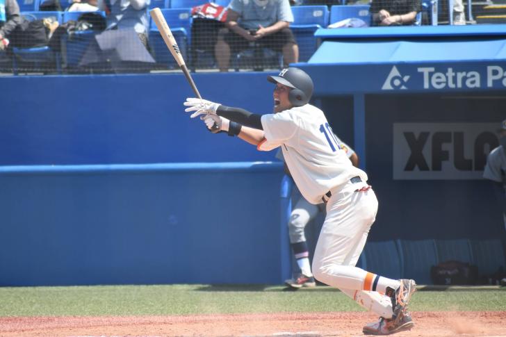 追いかける法大は4回表、先頭の1番・宮﨑秀太(営2)がリーグ戦初となる右越え本塁打を放ち、打線に火をつける。