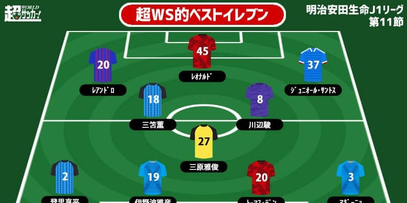 明治安田生命J1リーグ第11節のベガルタ仙台vsサガン鳥栖を除く8試合が19日に開催された。超WS編集部が各試合から印象に残った選手を選りすぐり、ベストイレブンを紹介する。