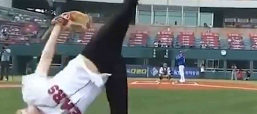 「CBSスポーツ」が再度、脚光を当てたのは2013年7月5日に行われた斗山ベアーズ対サムスンライオンズの一戦で行われた始球式。マウンドに上がったのは2008年の北京五輪に出場したシン・スジさん。シン・スジさんはマウンド上で大きく足を上げて一回転しながらボールを投じるアクロバティックな投球を披露した。