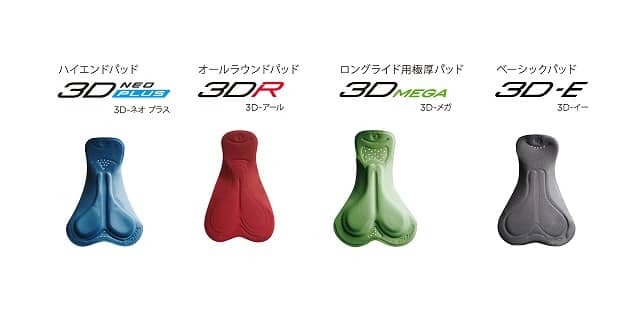ウェアの最大手パールイズミ社が製品に使用するパッドの一覧。乗車姿勢を研究し、走り方に合わせ、様々な層が求める性能を持った多様なパッドを用意している。さらに女性用も別途展開している。パッドも含めて自分に合ったアイテムを選びたい。画像提供:パールイズミ