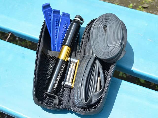 万が一のパンクに備えて、替えチューブやタイヤレバー(タイヤをホイールのリムから外す道具)、携帯用ポンプなどを準備しておきたい。最低限の調整ができる工具も必須アイテムだ
