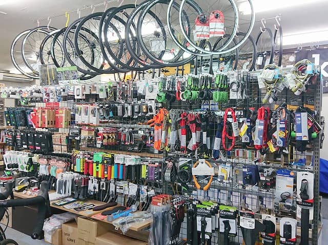 店舗にたくさんの自転車用パーツやアクセサリーが並ぶ YOUCAN 八王子店にて