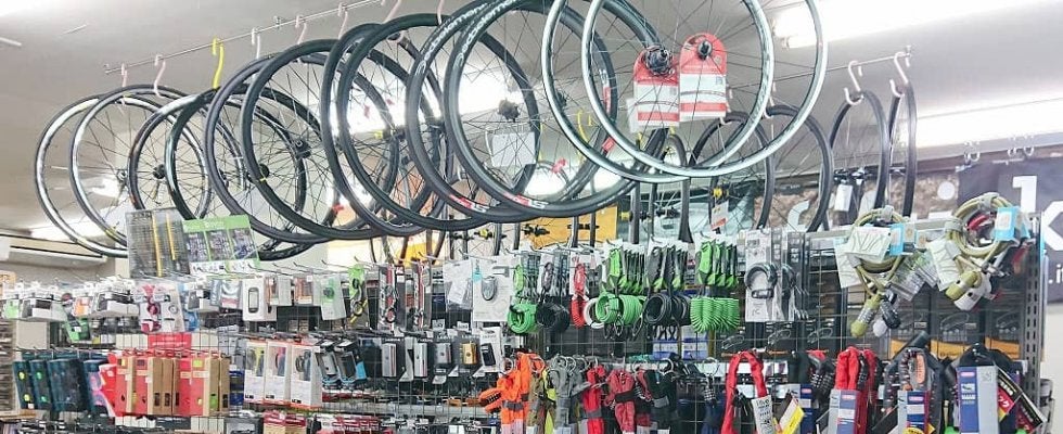 店舗にたくさんの自転車用パーツやアクセサリーが並ぶ YOUCAN 八王子店にて