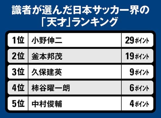 「天才ランキング」は、「日本サッカー界の天才と言えば、誰か?」というアンケートを識者15名に実施。天才と思う選手を1位~3位まで挙げてもらい、1位の選手を3点、2位の選手を2点、3位の選手を1点という形で集計。その合計ポイントによって、順位を決定した。