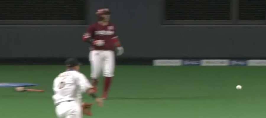 中田がこれ以上にないグラブトスを見せた。両チーム無得点で迎えた3回。日本ハムの先発・上沢は1死一、三塁のピンチを迎えた。楽天の小深田が一塁へセーフティスクイズを試みたが中田は猛チャージをかけそのままの勢いで本塁へグラブトスを決行しアウトを奪った。