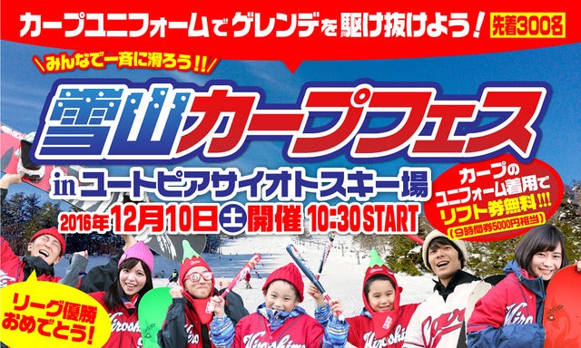 広島県と関係4市町で構成するひろしま雪山誘客促進協議会は、スキーシーズン到来を記念したイベント「雪山カープフェス」を2016年12月10日(土)に初開催する。