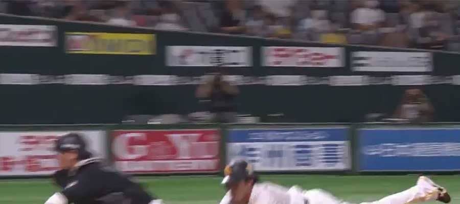 栗原の二ゴロで一塁へ送球した瞬間にホームへ突っ込む柳田