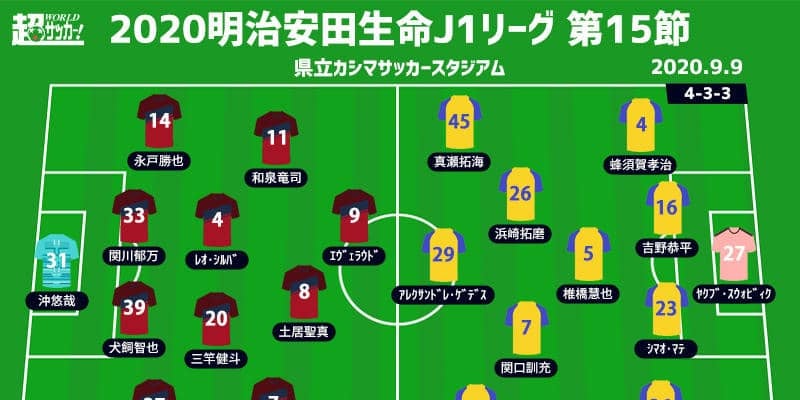 【明治安田生命J1リーグ第15節】 2020年9月9日(水) 19:00キックオフ 鹿島アントラーズ(9位/21pt) …
