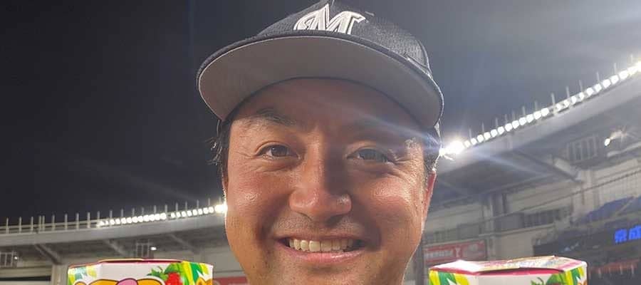 快投直後「コアラのマーチ」を両手に持ち笑顔のロッテ・澤村拓一【写真:球団提供】