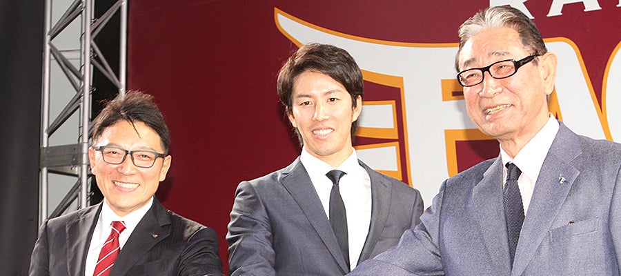 緊張の面持ちで、新天地の“第一歩”を踏んだ。大学まで過ごした東北の地。「プロになるまでたくさんお世話になって、支えられてここまで来た」。2007年の1年目から活躍し、いきなり2桁勝利を達成。田中将大投手にその座は譲ったが、11勝をマークして最後まで新人王争いを展開した。プロ10年で7度の2桁勝利。2014年には5月2日の千葉ロッテ戦でノーヒットノーランを記録するなど、実績十分の右腕に、楽天もFA宣言直後に速攻。星野取締役副会長の「迷ったら前へ」という口説き文句も響き、楽天・岸が誕生した。