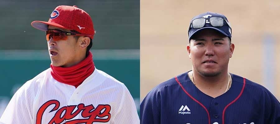 広島・上本崇司(左)と西武・山川穂高【写真:荒川祐史】