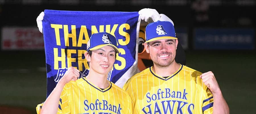 お立ち台に上がったソフトバンク・周東佑京(左)とマット・ムーア【写真:藤浦一都】