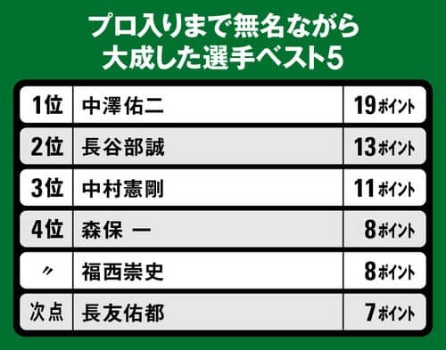 ※今回のランキングは、「プロ入りするまでは無名ながら、プロ入り後にJリーグや日本代表などで活躍し、大成功を収めた日本人選手は誰か?」というアンケートを識者5名に実施。1位の選手を5点、2位の選手を4点、3位の選手を3点、4位の選手を2点、5位の選手を1点というポイントをつけて集計。その合計ポイントによって、順位を決定した。