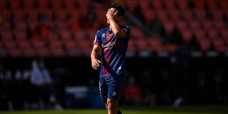 立ち上がりから動きの量と連動性で勝るウエスカは、決定機こそ作れないものの、ホームチームに攻撃の機会を与えず、互角以上に試合を運んでいく。しかし、38分には自陣右サイドで与えたFKの場面でキッカーのヴァスにゴール方向に向かう鋭い低弾道のボールを入れられると、ゴール前の密集をすり抜けたこのボールがそのままファーポストに吸い込まれ、名手ヴァスの直接FKで先手を奪われた。