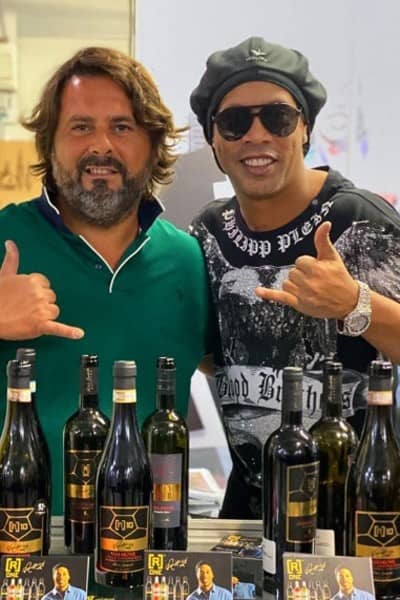 イメージキャラクターを務めるワインのワイナリー経営者と記念撮影するロナウジーニョ
