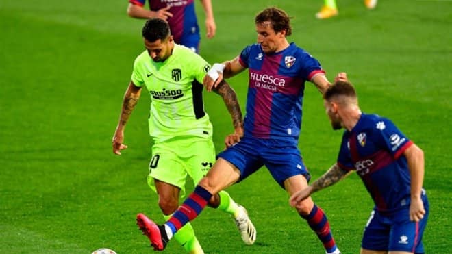 前半は開始から両者譲らない展開に。後ろから組み立てるアトレティコに対し、ウエスカは前線からのプレスから、高い位置でボールを奪いに行く。アトレティコはそのプレスにより、いくつか自陣内でミスを犯したが、ウエスカの得点に結びつくチャンスは生まれなかった。
